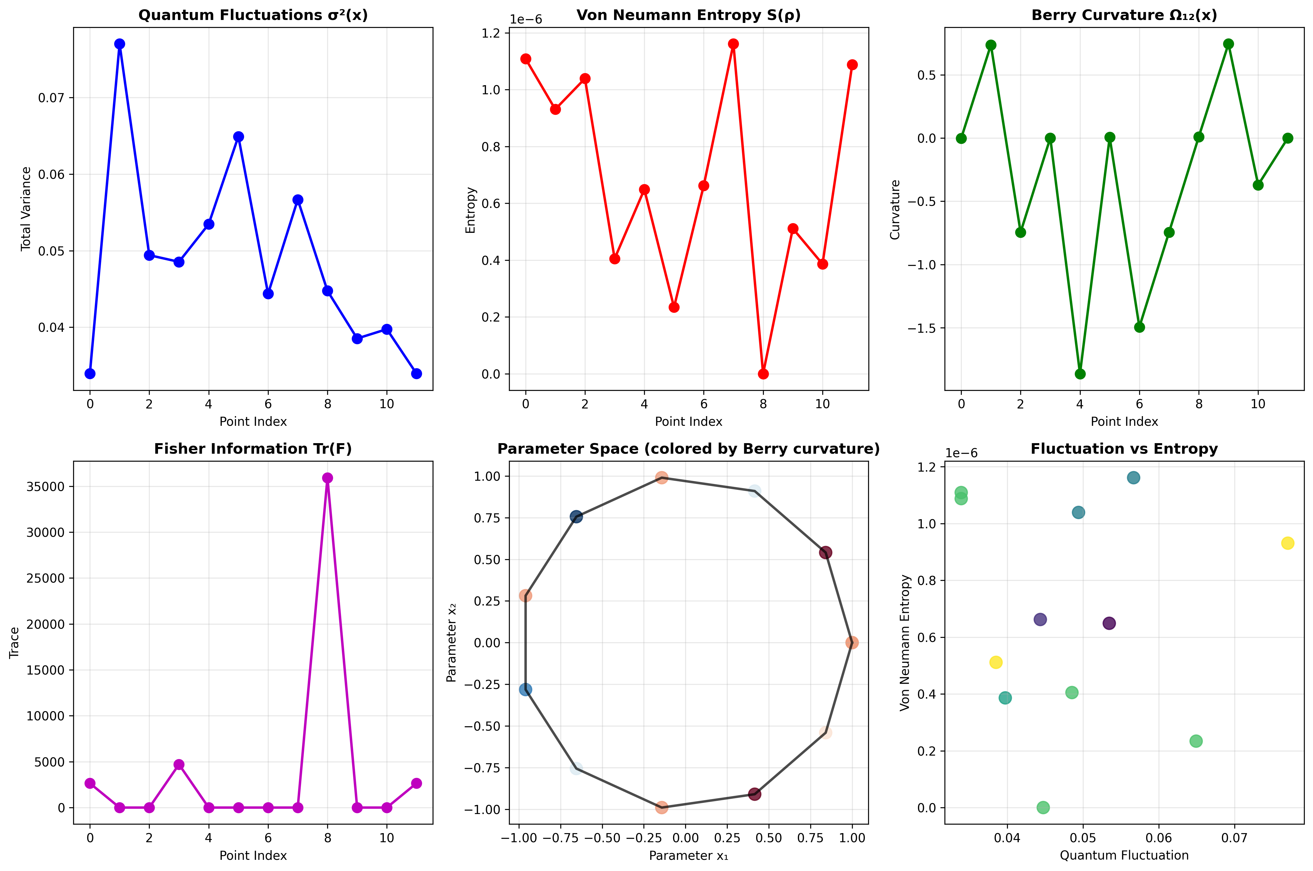 This comprehensive visualization shows six key aspects of quantum geometric analysis: