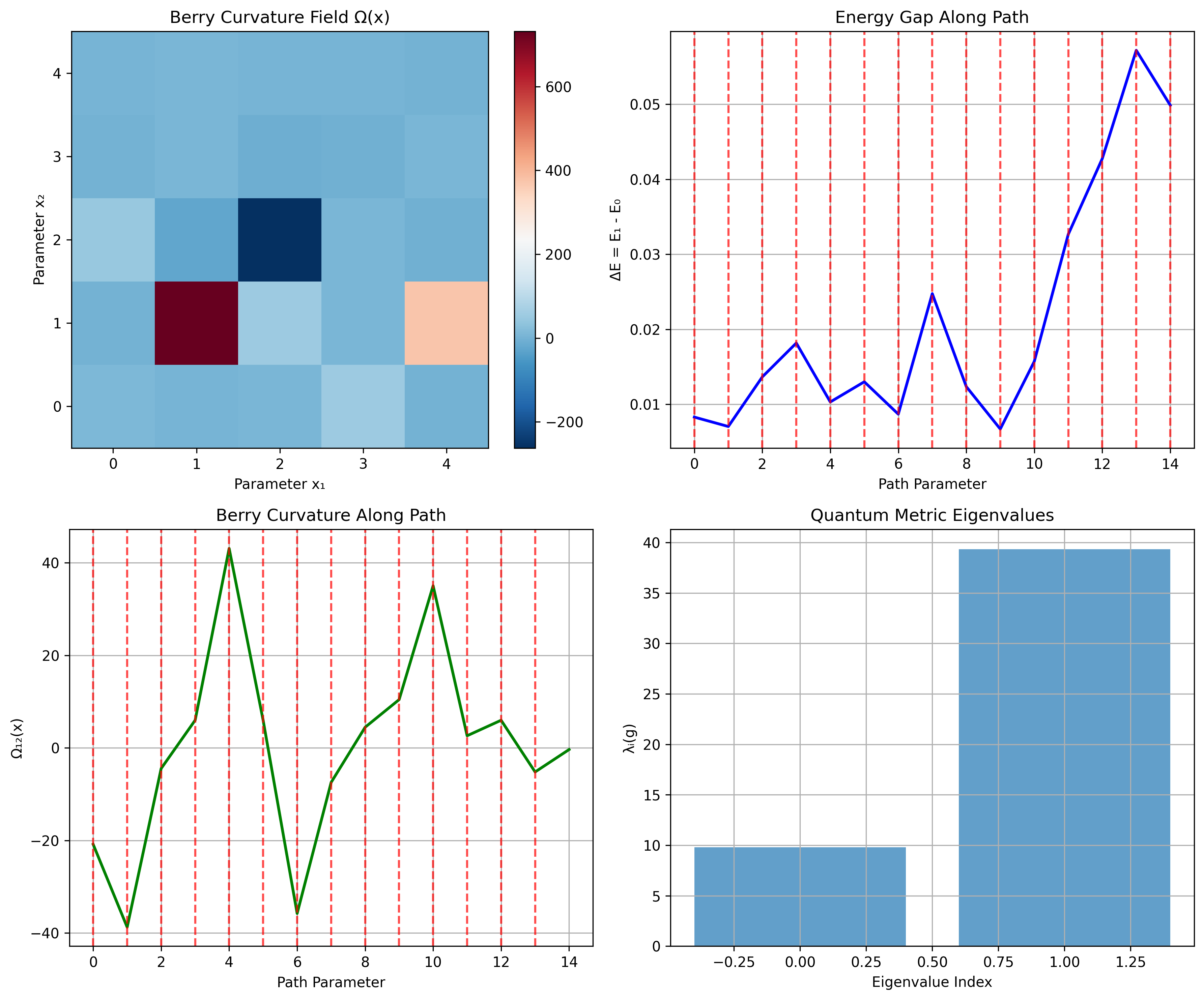 Complete Analysis Pipeline: - Parameter dimension: 2 - Hilbert dimension: 8 - Sample Berry curvature: -20.86 - Quantum metric trace: 49.13
